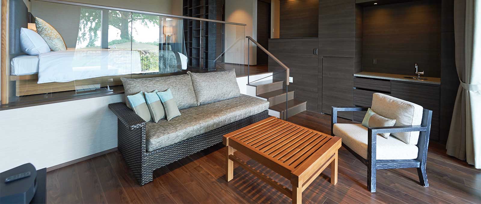 深い安らぎに浸るためのゲストルームは、全室温泉露天風呂とテラス付きのゆとりある空間。