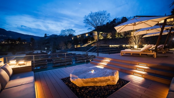 プールからつながるウッドデッキは、雄大な箱根の山々を眺めながら大自然の風を感じることができるスペース。開放感を贅沢に味わう「ととのいテラス」で思い思いにリラックスした時間をお過ごしください。