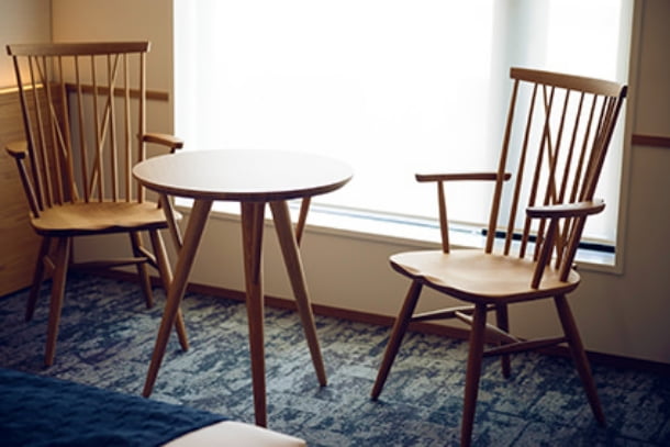 客室にも、飛騨家具や飛騨牛革・山中和紙などを用いたインテリア・小物・照明を随所に採用しております。