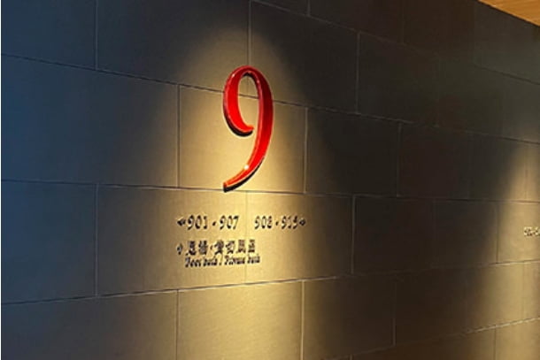 ラウンジには飛騨春慶の漆塗りの赤をアクセントに演出した象徴的な格子をデザイン。