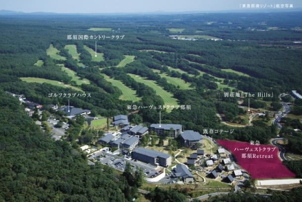 御用邸に隣接する「東急那須リゾート」は、敷地面積約102万㎡。会員制リゾートホテル「東急ハーヴェストクラブ那須」をはじめ、名門ゴルフ場「那須国際カントリークラブ」、別荘地「The Hills」を備えた複合施設です。