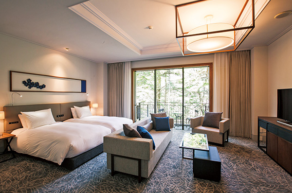 全50室のコンテンポラリーな客室は、約9割が48㎡を超える広々とした間取りです。どの部屋にも、軽井沢彫のアートワークが飾られています。