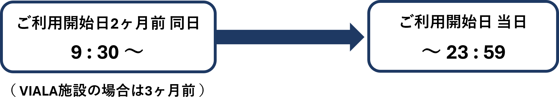• VIALA会員様がVIALA施設をご利用する場合は、3ヶ月前の同日9:30より承ります。