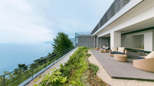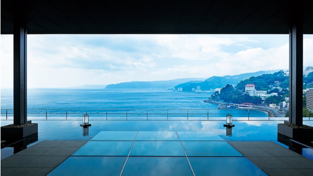 心を潤す海の遠景。遠くに広がる紺碧の水平線にとけ込み水の景観に感性が満たされる高台のガーデン&プール、心地よい風を感じながらくつろげる屋根付きジャグジーをご用意しました。