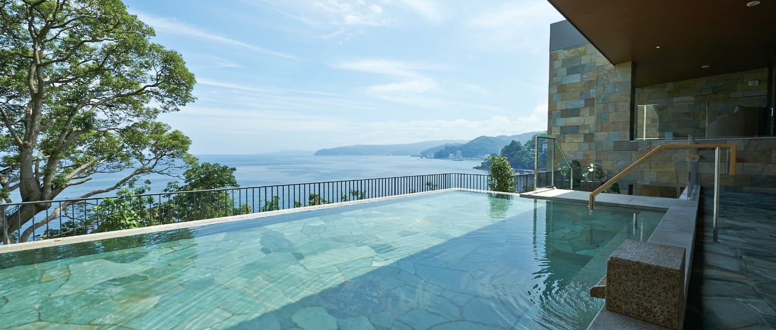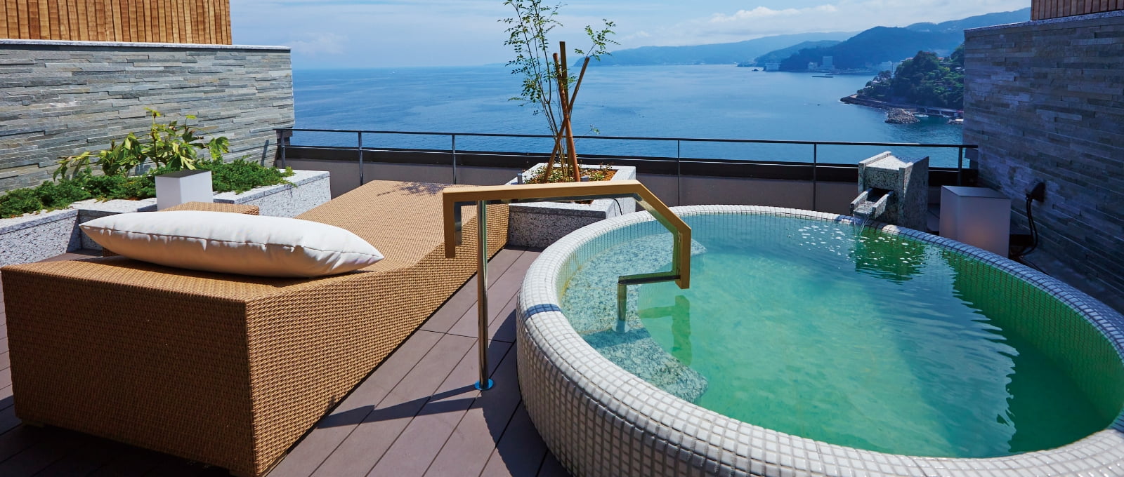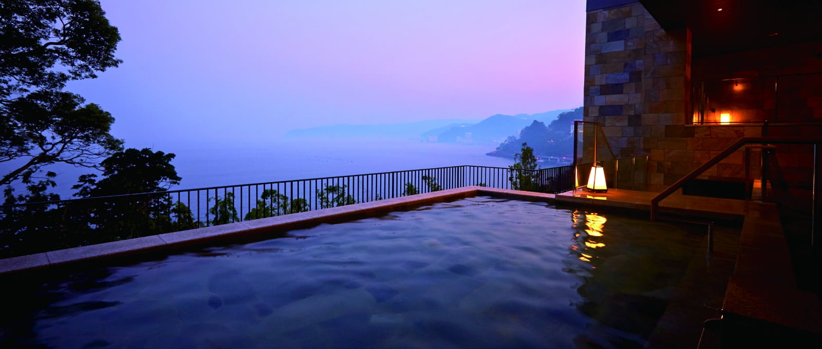 潤いに満ちた風景と名湯を堪能できる温泉露天風呂。樹林風呂と海眺望風呂の2種類をご用意しました。