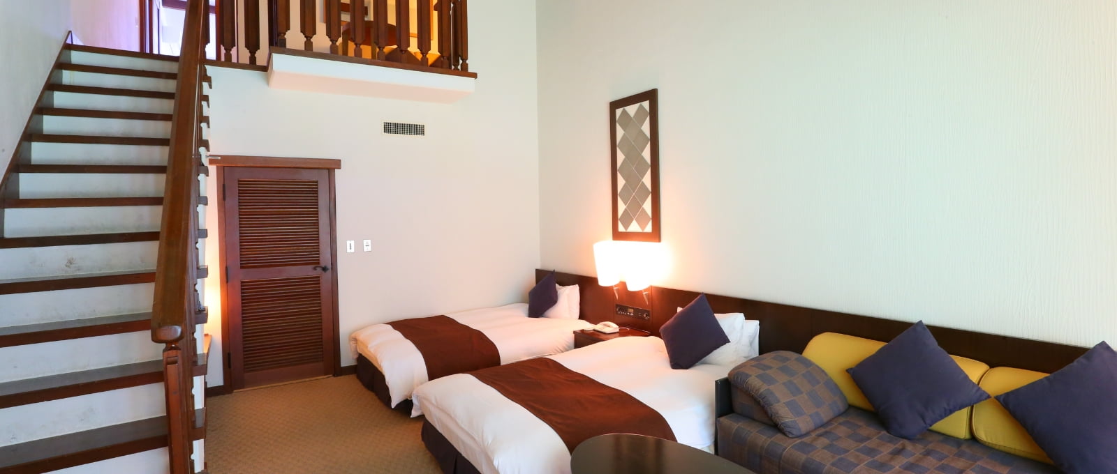 別荘感覚でくつろげる2層吹き抜けのメゾネット客室もご用意。プライバシーと開放感を兼ね備えた、ゆとりと温もりを感じられる、ご家族、グループ向きの空間です。