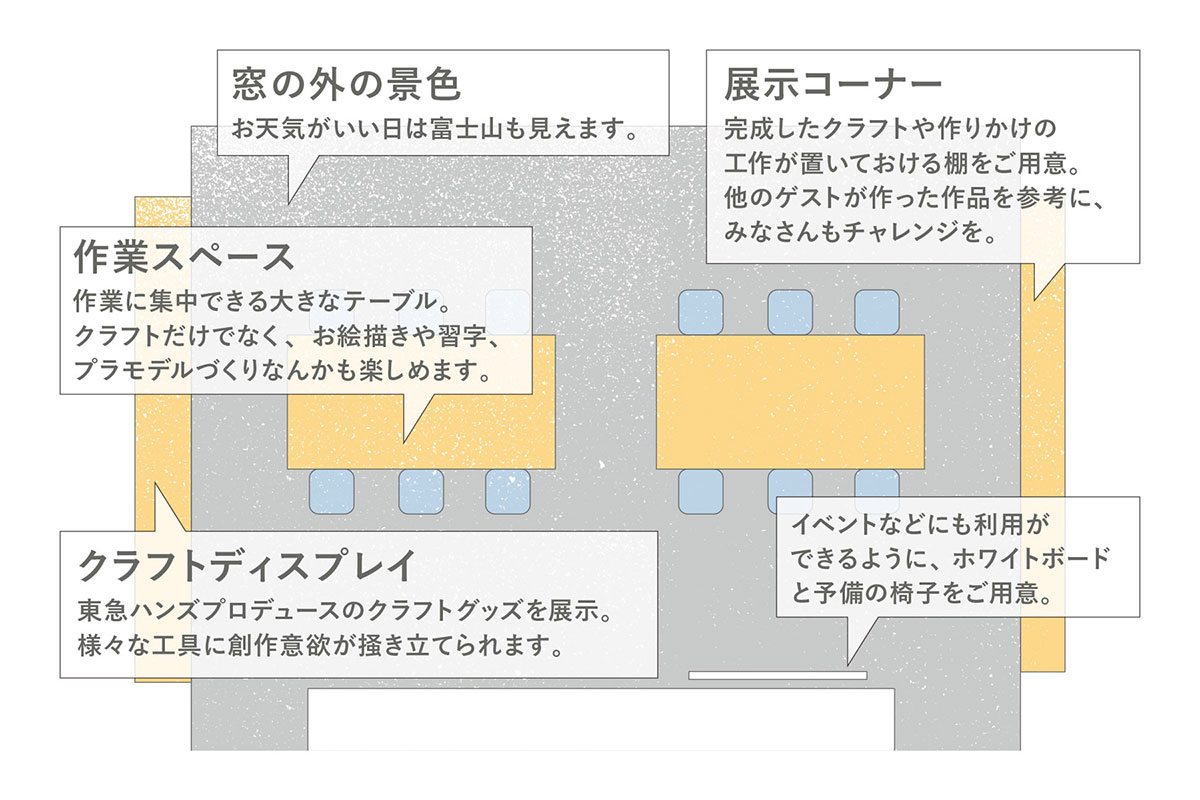 天城高原のリゾートステイをより豊かにする、ものづくりのためのラウンジです。 窓から富士山を望むお部屋の中で、趣味のくつろぎの時間をお愉しみください。 天城を訪れるたびに「作りたいもの」を発見し、訪れるたびに創作の「つづき」を楽しむ。 趣味の活動の場として自由にご利用いただけます。 また、革細工やカービング・刺繍セットなど、東急ハンズセレクトのキットをホテル内でもご購入いただけます。 都会の喧騒を忘れ、窓の外に広がる壮大な景色を眺めながらほっと一息。 人生を彩る自分の趣味を、天城高原のゆったりと流れる時間の中で楽しみませんか。