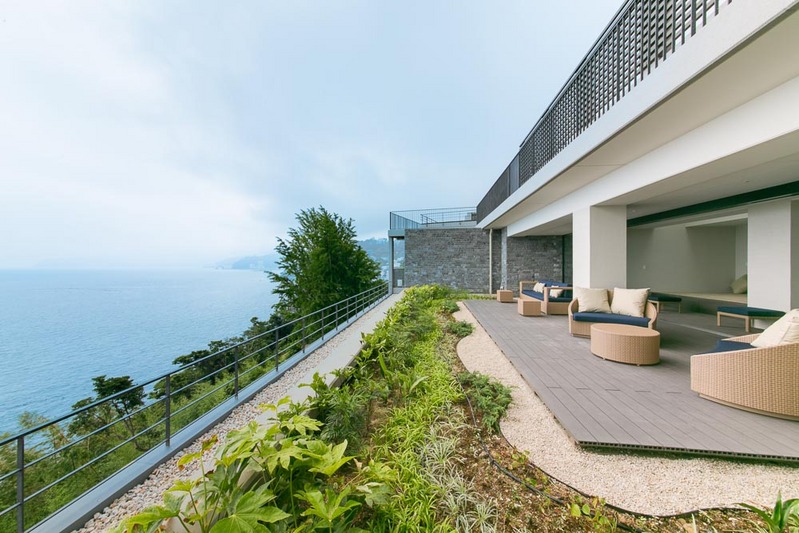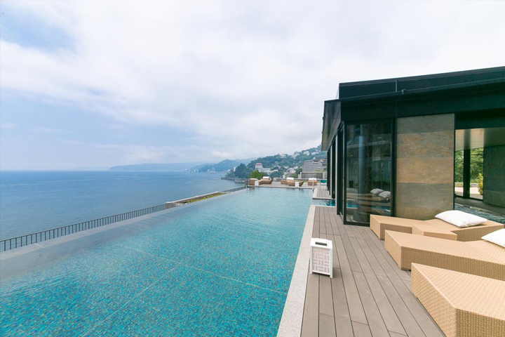 心を潤す海の遠景。遠くに広がる紺碧の水平線にとけ込み水の景観に感性が満たされる高台のガーデン&プール、心地よい風を感じながらくつろげる屋根付きジャグジーをご用意しました。