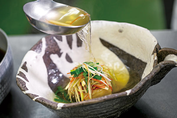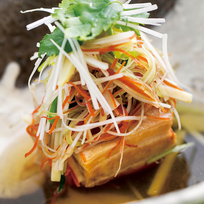 メインの肉料理は「豚の角煮」。キメが細かく甘い脂が特徴の千葉の銘柄豚肉「チバザポーク」のバラ肉を、醤油などを加えた鰹出汁でじっくりと煮込んだあと、粉をまぶして油であげ、出汁にくぐらせた筍、牛蒡、人参、千社唐(ちしゃとう)、独活(うど)などの細切りをトッピング。さらに出汁を張ってお椀のように仕立てました。
