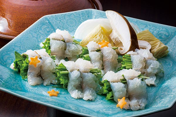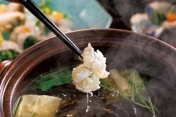 見た目が美しい鱧鍋。しゃぶしゃぶのようにさっと火を通していただくと、口の中に鱧と鰹の出汁の旨味が広がります。