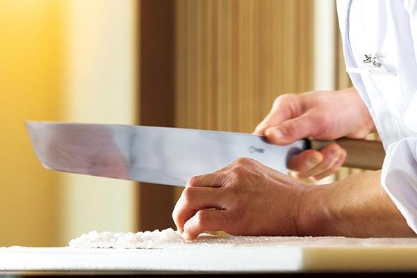 「今回のコースでは鱧と鮑を王道の調理法に加え、一捻りしたお料理もご用意しました。鱧は鱧鍋、鱧雑炊のほかサラダ仕立てに。鮑は定番の造りのほか、塩釜焼きやおひたし、お椀などもご堪能ください。熱いものは熱く、冷たいものは冷たく召し上がっていただくこともモットーにしていますので、ぜひできたてをお召し上がりください」。