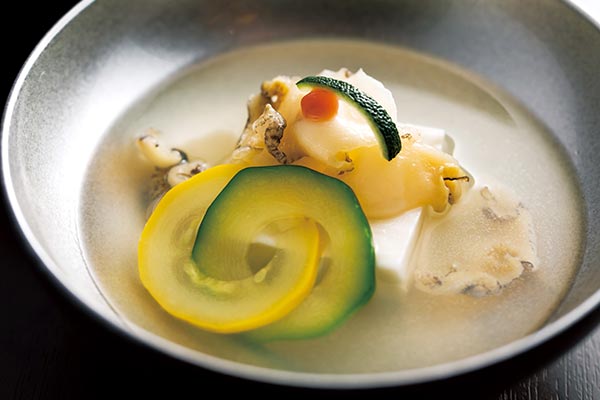 続く小吸椀は、薄切りの鮑と白胡麻豆腐に、とろみのある薄葛仕立ての出汁を張りました。ぷりっとした鮑の食感となめらかな胡麻豆腐の食感のコントラストが楽しい一品です。