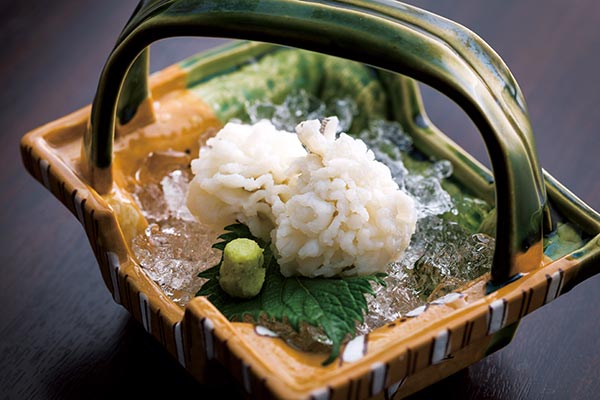 今回メイン食材として選んだ鱧は、和歌山県の紀南地区が名産地として知られ、産卵に向けて栄養を蓄える6〜8月にかけて旬を迎えます。走りの鱧は脂や旨味が乗っておらず、名残は骨が固くなるので、ぜひ旬の時期にお召し上がりいただきたいと会席コースに取り入れました。