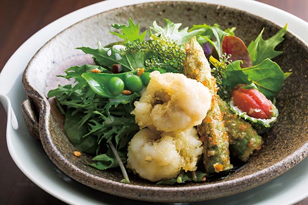 揚物は、鱧天ぷらとアスパラおかき揚げ、クエ梅干し天に夏野菜を合わせてサラダ風に仕立てました。梅肉と豆乳で作ったドレッシングでさっぱりとどうぞ。