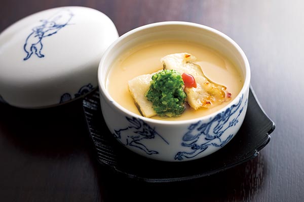 蓋物は、味噌漬けにして焼いた鱧、百合根、オクラを茶碗蒸し仕立てにした「鱧味噌漬け玉〆」。アクセントにそえた梅肉が鱧の味噌風味と絶妙なハーモニーを奏でます。