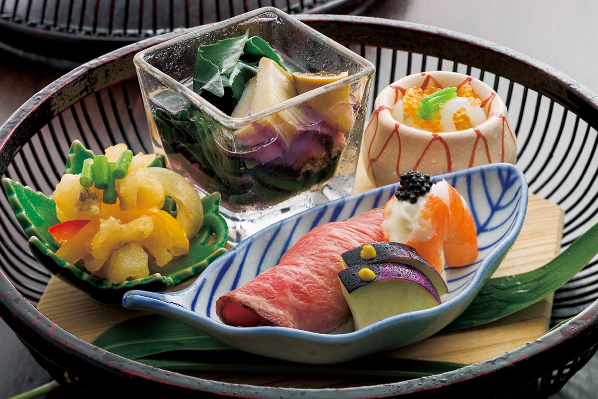 「鱧鮑フェア会席」は、紀州の伝統工芸、山中塗の涼しげなかごに盛り付けた前菜からスタート。揚げた鱧と野菜を、合わせ酢で漬けた「鱧あちゃら漬け」をはじめ、「金時草のお浸し」には、蒸し鮑のスライスとボイルした鮑の肝を添えました。「ローストビーフ寿司」や「烏賊真砂和え」など目にも鮮やかな料理が登場します。