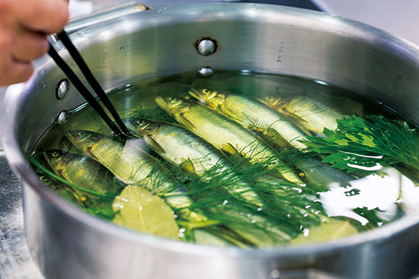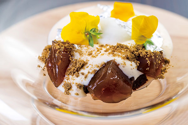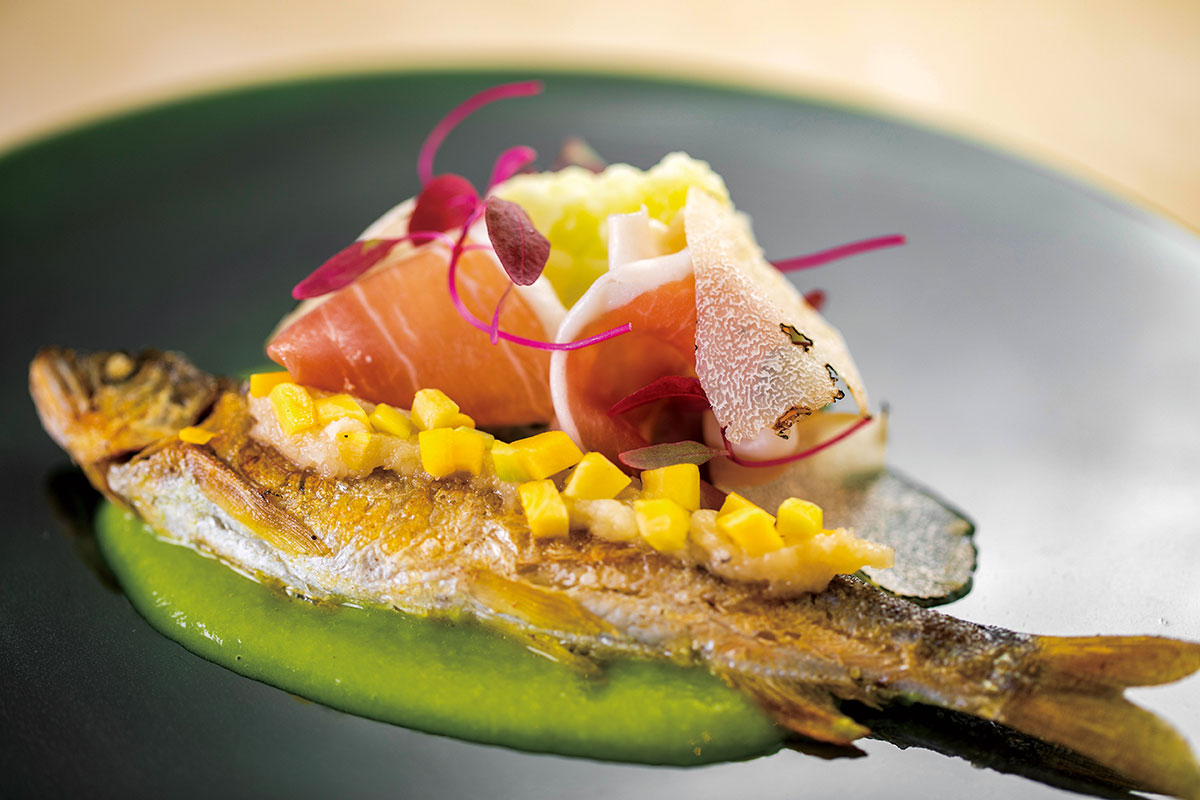 鮎をまるごと、たっぷりのイタリア産のオリーブオイルで3時間ほど煮込み、仕上げにオーブンで表面をパリッと焼き上げます。ピューレ状にした万願寺とうがらしソースの上に、鮎をのせ、さらにマリネした香味野菜と鈴かぼちゃを乗せて彩り豊かに。傍らにはメロンのソルベと生ハムを添えました。じっくり煮込まれた鮎は、頭から尾の先までまるごと食べられるホロホロの食感。ほろ苦い万願寺とうがらしの風味と生ハムが纏う薫香と塩気、二つの味わいが鮎の美味しさをさらに引き立てる趣向です。