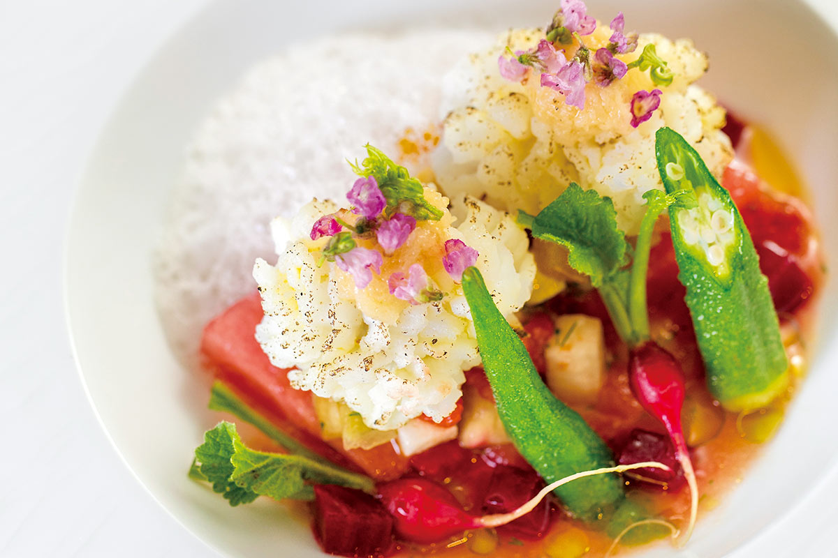 アンティパストは、日替わりの夏野菜と鱧を使った「鱧と夏のお野菜 トマトのクーリーと花穂を散らして(冷菜)」。鱧は骨切りし、昆布出汁で湯引きしてプリッとした歯ごたえに。鱧の下に敷いているのは、なんとスイカ!オリーブオイルとイタリアンビネガーでトマトや水なす、きゅうり、パプリカ、山芋、刻みミョウガなどをマリネした甘酸っぱいベジタブルソースを合わせたら、さらに鱧の旨味が移った出汁を煮詰めた泡ソースを添えました。