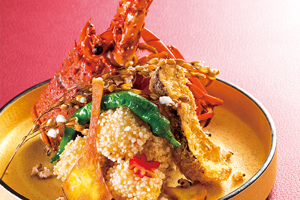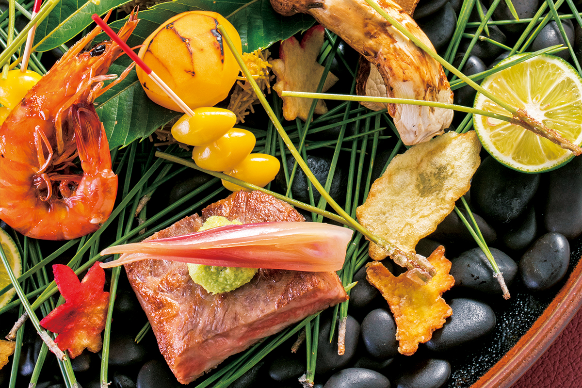 メインの焼肴「焙烙焼き」は、秋風で落ち葉が寄せられた様を表現した“吹き寄せ”仕立てに。今回は焼いた石の上に松葉を敷き詰め、香り高い焼き松茸や相州牛の刺しの入ったとろけるようなサーロインステーキ、車海老の塩焼き、栗や銀杏を盛り合わせました。周りには木の葉に見立てたジャガイモやサツマイモの煎餅を散らして。和食ならではの季節感を追求した料理長・水口の真骨頂がここにあります。