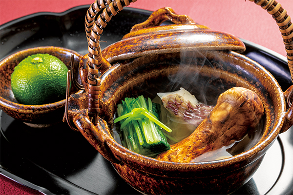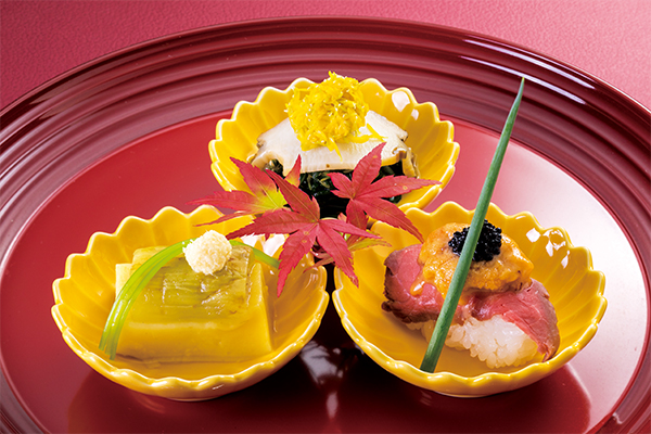 先付けは、相州牛の旨味たっぷりのもも肉をローストして生うにとキャビアをトッピングした牛寿司、煮鮑を乗せた松茸と菊菜のお浸し、茄子の葛寄せが食卓に秋の彩りを添えます。椀物は定番の、滋味深い松茸と鯛の土瓶蒸しをどうぞ。
