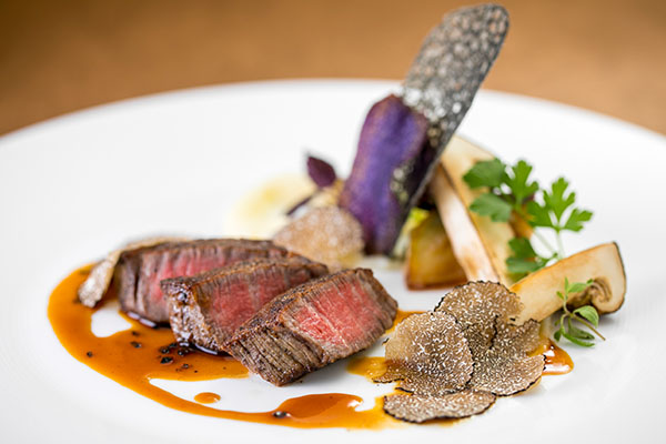 メインには相州牛のフィレステーキに炙った松茸とトリュフを添えた贅沢な一品。和洋を代表するキノコの芳醇な香りを、目一杯引き出したひと皿です。