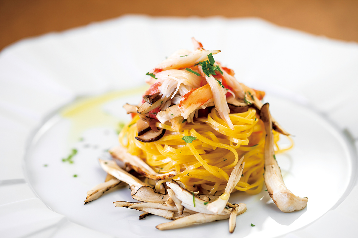 パスタはズワイガニと松茸のトンナレッリ。イタリア料理の手法で松茸の新たな魅力を引き出せるよう、バターとパルミジャーノのコクのあるソースで味付けしました。