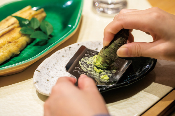 御造り「伊豆近海鮮魚の三種盛り合わせ」とともに登場するのは丸ごと1本のわさび。会席を通してお好きなタイミングでお好きな量を擦ってお召し上がりください。続く焼き物の「鰻の白焼き」は800〜900℃の炭火で直焼きするので、遠赤外線効果により外はカリッと中はふっくら。香ばしい香りをまとった鰻はまさに絶品。この機会にぜひご堪能ください。