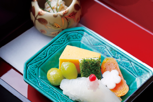 「天然クエ鍋会席」は、重箱入りの前菜からスタート。梅ポン酢おろしでいただく“クエの握り寿司”や、“天然クエ切らず”をご用意いたします。“切らず”とはおからのことで、今回は焼いたクエのほぐし身をしっとりとしたおからと合わせています。そのほか、季節を感じる銀杏の素揚げや、柚子のカステラ、唐墨大根、奈良県西井牧場がつくる古代チーズの“飛鳥の蘇”なども盛り合わせました。