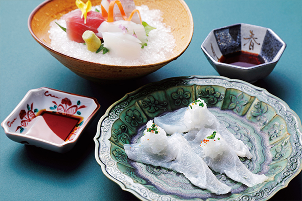 続くお造りは、天然クエの薄造りをどうぞ。クエは内臓を取り3日ほど冷蔵庫で熟成することで旨味をさらに醸成させます。和歌山の北山村で栽培されているじゃばらを使った、料理長オリジナルのポン酢でさっぱりとお召し上がりください。別盛りで旬魚を3点ご用意します。