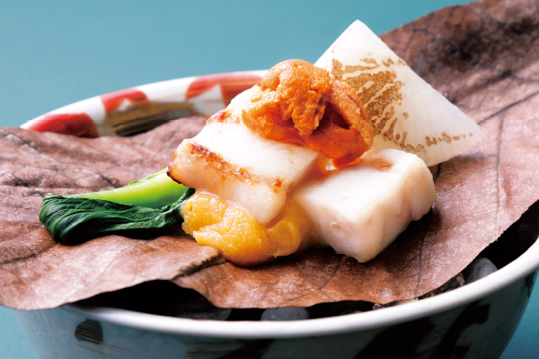 続く焼物は、天然クエ炭火焼き。枯れ朴葉を器に、白味噌ベースに卵の黄身を加えた白玉味噌を敷き、クエの塩焼きと雲丹をのせました。さまざまな味わいが相まって独特のハーモニーを生み出します。