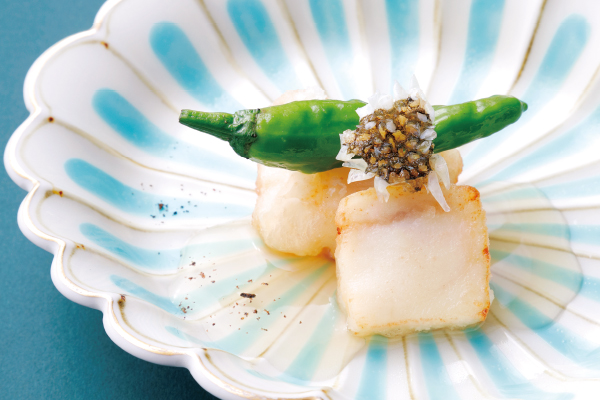 揚物は、天然クエ唐揚げをご堪能ください。トッピングのカリカリに揚げたクエの皮が食感のアクセントに。京都の千鳥酢を使い、吉野葛でとろみをつけた甘酢あんと、山椒が香りたつ黒七味を合わせると、さらに食欲をそそるでしょう。