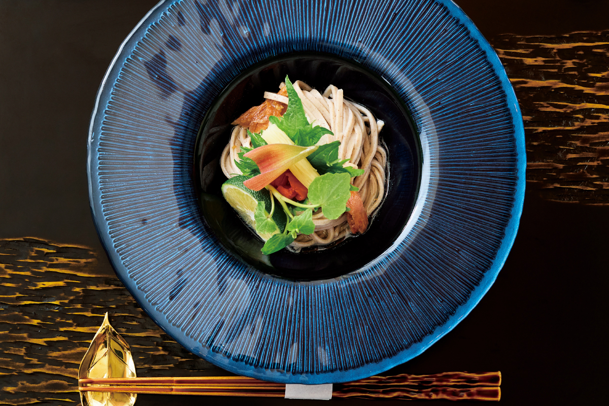 一本漬けのへしこはスライスし、天火で軽く焼いたあとほぐし身に。これを冷水でしめた平打の越前蕎麦に絡めて盛りつけます。福井県は2020年の「おいしい蕎麦産地大賞」でグランプリを獲得した実績があるほどの蕎麦の名産地。この蕎麦とへしこにエゴマ油を少しだけ加えることで、しっとりとなじませました。