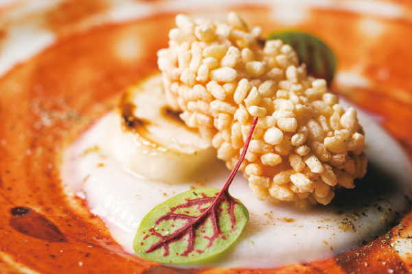 さらに温前菜は「リ・スフレを纏ったサーモンクロケット 蕪のクリームソース」。サーモンクロケットの衣に使ったリ・スフレは軽い食感の日本のポン菓子のようなもの。濃厚な味わいの蕪のポタージュソースでお召し上がりください。京都宮津産のオリーブスパイスがアクセントに効いた一皿です。