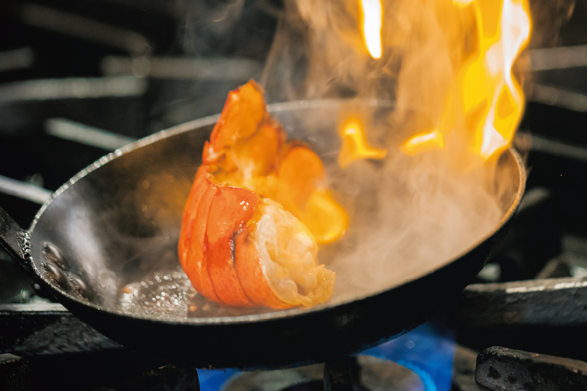 京フレンチコース Gyokuは、そんな料理長の真骨頂をご堪能いただける全8品の贅沢なフルコース仕立て。中でも魚料理の「オマール海老のロースト 焼きリゾットを添えて」は、料理長のイチオシです。カナダ産オマール海老を一尾使い、フレンチ定番のブールブランソースと海老の出汁をたっぷり使ったアメリケーヌソースの二種を合わせました。付け合せは焼きおにぎり風のリゾット、伏見とうがらし、プチトマト、ブナシメジなど。添えられたタイムの香りが清涼感を醸し出します。