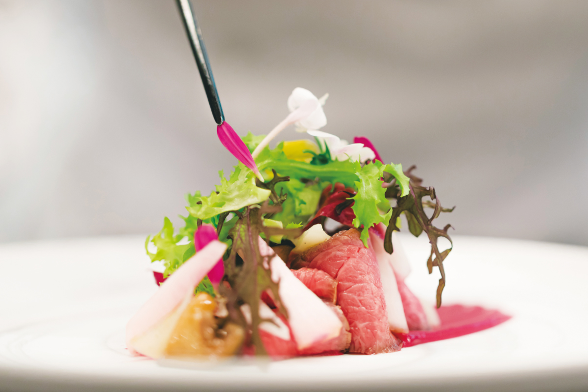 冷前菜は「国産牛肉のカルパッチョ」。牛肉は低温調理でしっとりジューシーに。ソースは塩麹を隠し味に効かせたレフォールソースと甘酸っぱいビーツソースの二種で、京都の赤カブの漬物、素揚げの百合根、京丹波大黒本しめじのマリネ、季節の野菜もご一緒にどうぞ。