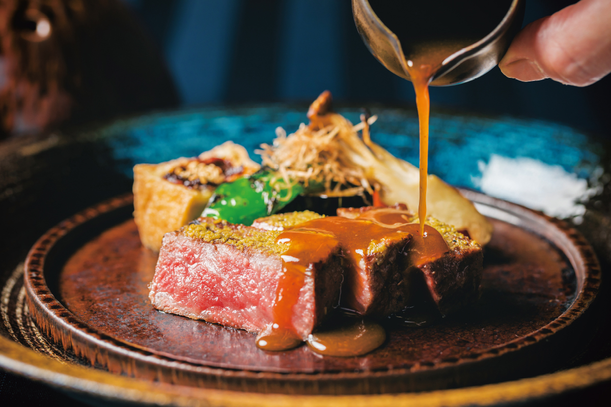 魚料理に続くメインの肉料理は「近江牛ロースの網焼き ワサビ風味」。グリルした近江牛のサーロインを引き立てるのは、牛骨、牛すじ、香味野菜で取ったスープをベースにしたフランス料理伝統のソース、ジュドブッフ。付け合せには京人参、万願寺とうがらし、地元の豆腐店の厚揚げには老舗味噌店の山利商店の黒もろみを添えました。