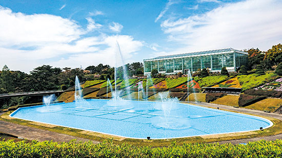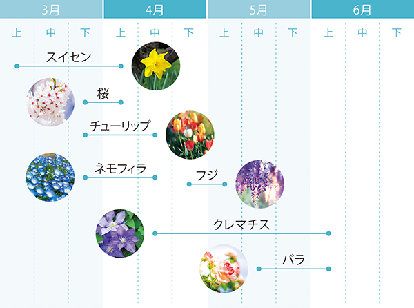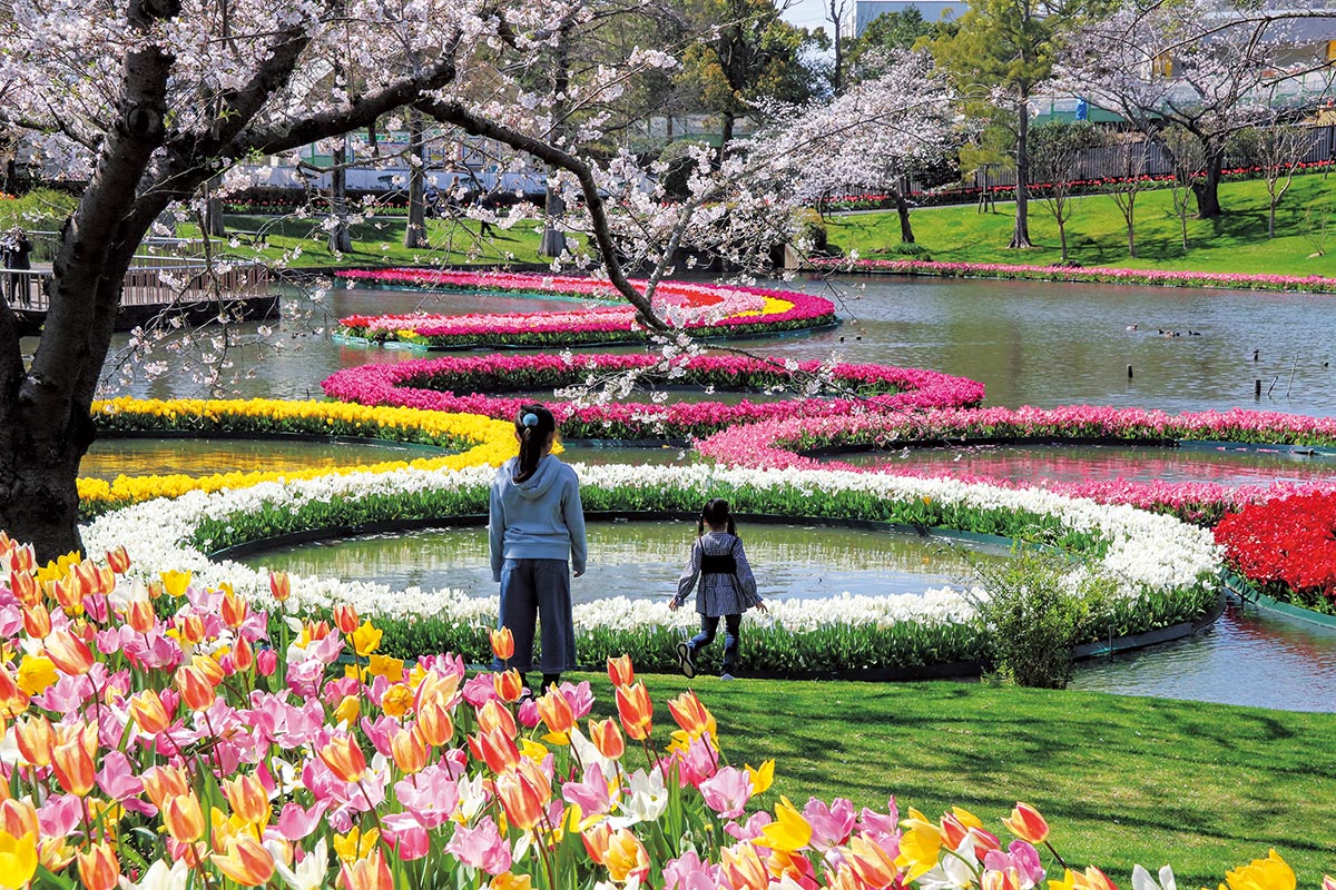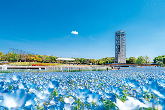 ここは2004年に開催された「浜名湖花博」の会場跡地を活用した公園で、スイセン、クレマチスが咲き誇るほか、4月には一面ネモフィラのブルーの絨毯に包まれる。公園の中央に立つ高さ50mの展望塔からは、浜名湖八景に選ばれた360度の大パノラマを見ることもできる。