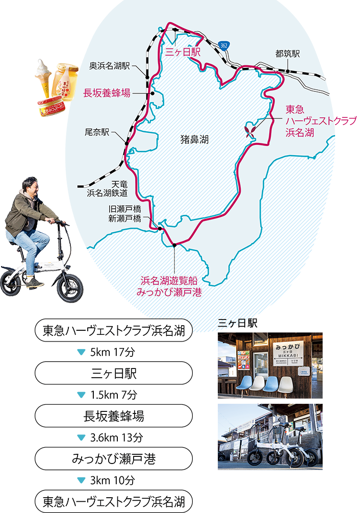 館山寺エリアの浜名湖サイクリングよりも手軽に楽しめるのが、ホテルの近くをぶらっと巡る猪鼻湖でのポタリング。湖畔沿いの景色が美しい浜名湖レークサイドウェイを走ったり、趣のある吊橋、旧瀬戸橋を渡ったりと浜名湖ならではの景色を見ながら自転車散策が楽しめる。また、国登録有形文化財に登録されている天竜浜名湖線の「三ヶ日駅」は昭和初期に建てられた木造駅舎で、レトロな雰囲気が魅力的。