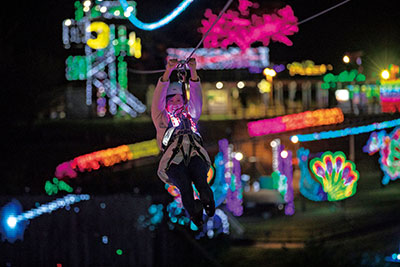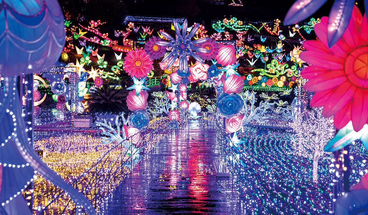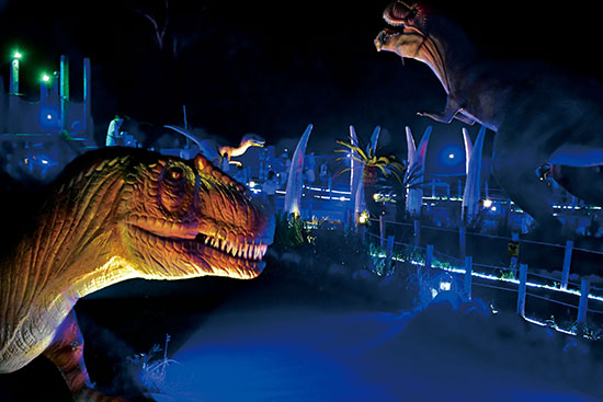今年はイルミネーションの上を歩くことができる「ウォークオンザイルミ」が新登場。また、往復400mの「ジップライン~流星RYUSEI~」は、イルミネーションの上を滑空するアトラクション。スマホを装着して大迫力の動画を撮ることもできる。ステゴサウルスやトリケラトプス、ティラノサウルスなど実物大の約20体の恐竜が棲むエリアをゴーカートで駆け抜ける「ディノエイジカート」も大人気。このほかオーロラが躍動しているかのような「フルカラーレーザーショー」、幅60mの超大型ビジョン「グランビジョンショー」、音楽と光のコラボ「光と音のショー」なども見逃せない。