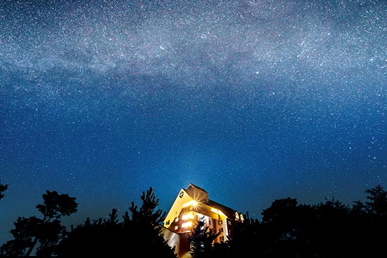 また、ゆっくりディナーを愉しんだあとは、星空観賞がおすすめ。ホテル前のスターフィールドは周囲に灯りがなく、漆黒の夜空に輝く星々の美しさは格別。フロントではビクセンの双眼鏡、星座早見表、LEDコンパス、野外用チェアなどの天体観測セットの無料貸し出しも行っている。