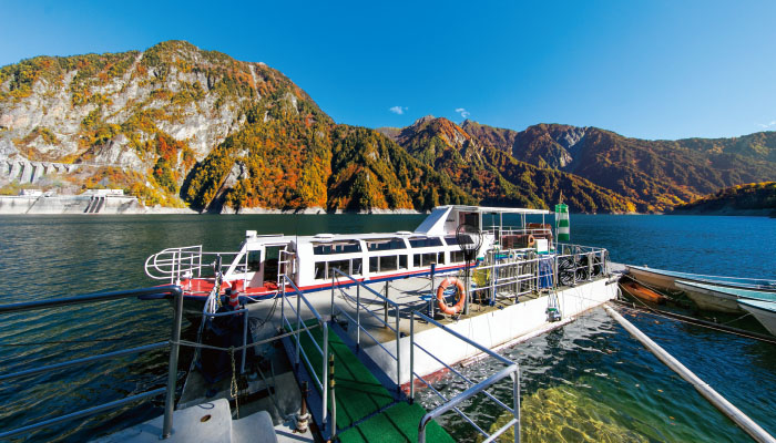 さらに堤の上の歩道を歩いた先には黒部湖遊覧船ガルベの乗船場もある。山々の紅葉とダムの対比を眺めながら約30分の船旅を楽しもう。