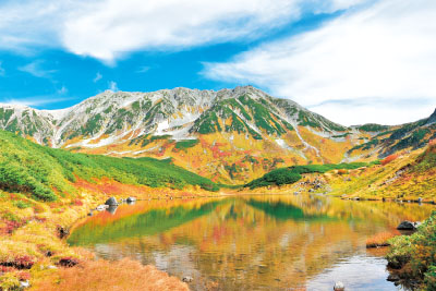 雲上の楽園と言われる「室堂」も立山黒部アルペンルートの目玉の一つ。扇沢からは往復約5時間で楽しめる。「黒部湖」からはケーブルカーで「黒部平」へ、さらにロープウェイで「大観峰」を目指そう。眼下に望む紅葉や黒部湖など迫力満点の大パノラマは必見だ。「大観峰」から立山の主峰、3003mの雄山直下を貫くトンネルをトロリーバスで走り抜けると、「室堂」に到着。標高約2450mに位置するなだらかな高原で、石畳の遊歩道も整備されているので気軽に散策してみよう。おすすめは北アルプスで最も美しい火山湖と言われる「みくりが池」を1周する約1時間のコース。天候がよければ青い水面に錦の山々が映り込む、息を呑むような美しさを目のあたりにできる。