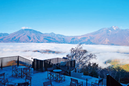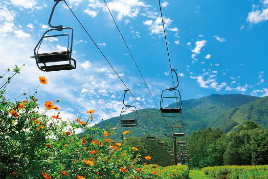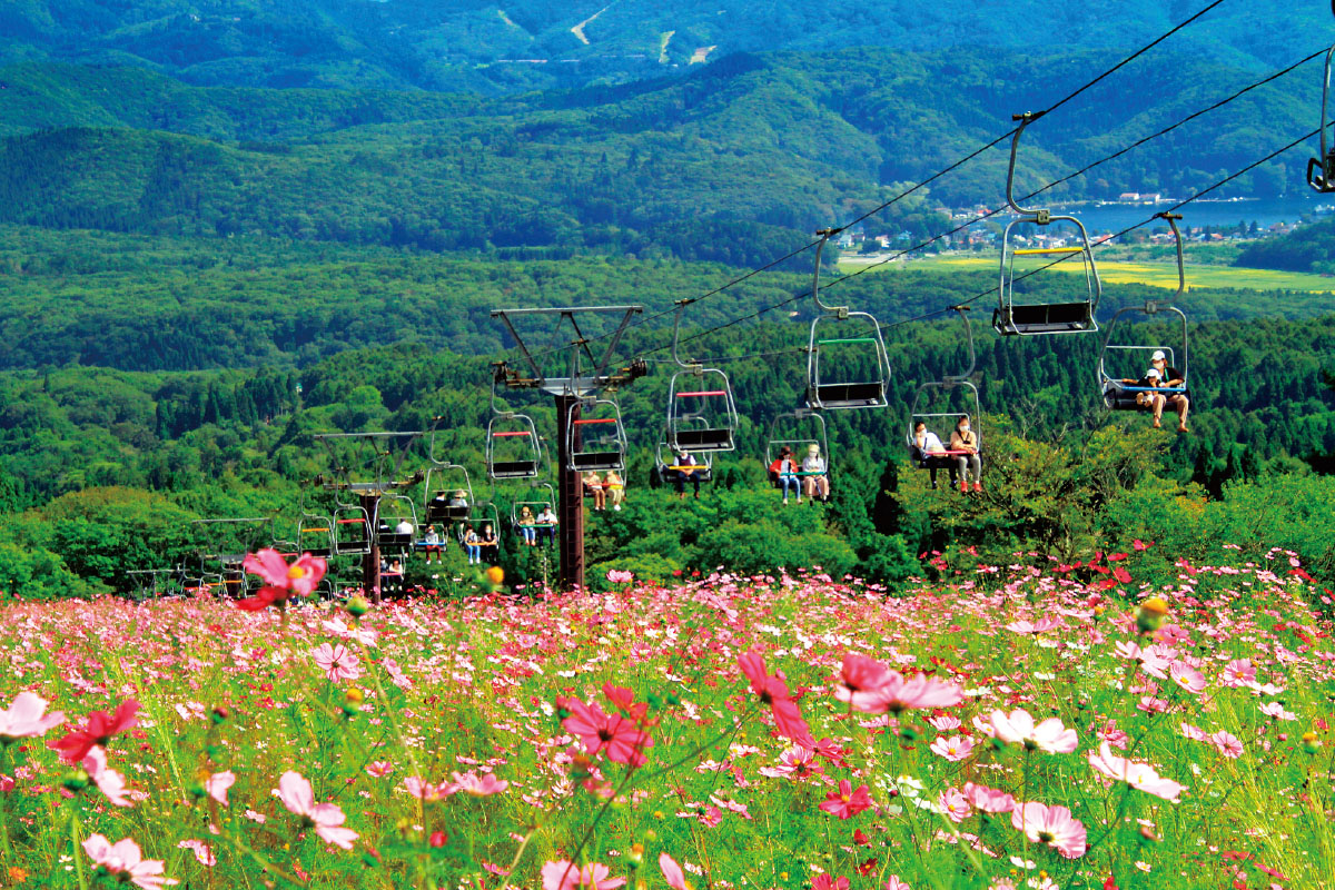 美しい景色を楽しめるこの季節、リフトに乗って絶景を楽しむ空中散歩はいかがでしょうか。標高1,100mに位置する野尻湖テラスに向かう「野尻湖テラス観光リフト」からは紅葉色づく山々が一望。黒姫山の裾野に広がる黒姫高原 コスモス園では、「黒姫パノラマリフト」で移動しながら、眼下一面に咲き誇るコスモスを愛でることができます。