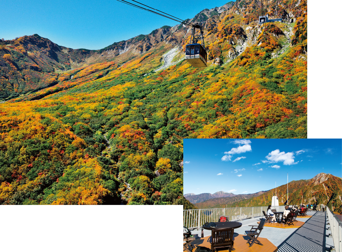黒部ダムや大観峰、室堂など見どころも盛りだくさん。特に山々が錦に染まる紅葉の時期は、見る者を圧倒する絶景が広がる。