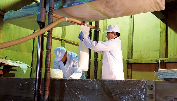 片山酒造の醸造のこだわりは、昔ながらの佐瀬式というもろみの搾り方だ。もろみは栃木県産の酒米五百万石に酒母、麹、水を加えて発酵させたもの。仕込みタンク一つにつき、もろみ約4000リットルを人の手で500枚の酒袋に袋詰めし、木槽(佐瀬式圧搾機)に積み重ねて3日間かけてゆっくり搾っていく。