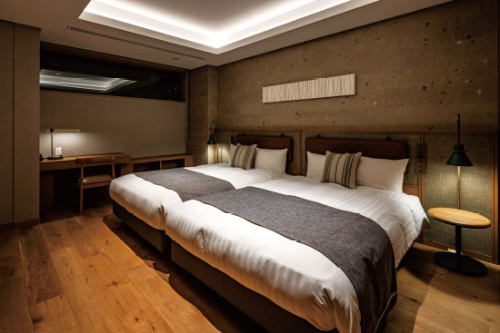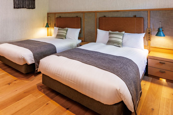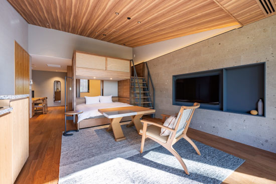 デラックスは、リビング・ダイニングとベットルームからなり、標準定員は2名で最大4〜5名に対応。ロフトベッド付きや、プライバシーを確保しながら交流も楽しめるコネクティング対応客室、ペットと一緒に過ごせる客室、ユニバーサル仕様の客室などを揃えました。