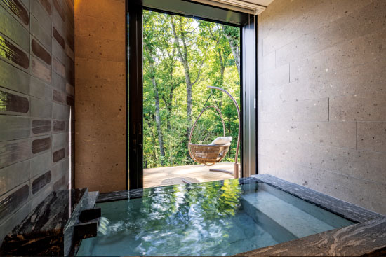 gardenの客室には半露天の温泉風呂が設けられ外の景色を眺めながらバスタイムを愉しむことができる