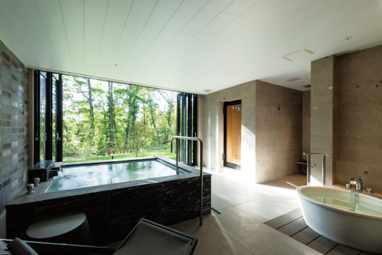 折戸をたたみ開け放てば、外との一体感がここちよいシグネチャースイート(146㎡)のバス。バスルームには個室サウナと水風呂も完備