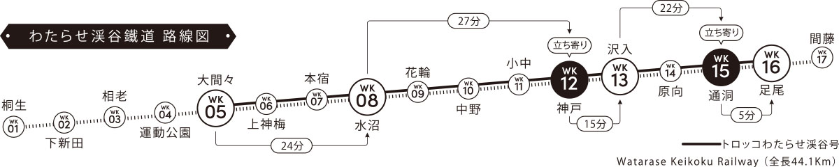 群馬県の桐生駅と栃木県の間藤駅間の約44kmを結ぶわたらせ渓谷鐵道。もともとは足尾銅山から産出された銅を運ぶ目的で敷設されたという。