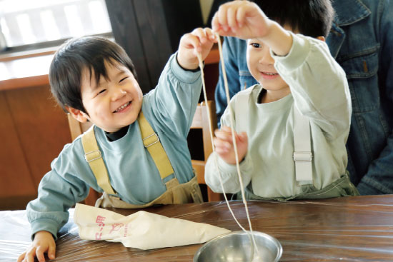 また、南ヶ丘牧場は創業当初から乳製品の生産、加工、販売を行っており、飼育しているのは日本では珍しいガーンジィ牛。高脂肪でコクのある「ガーンジィ ゴールデンミルク」は那須ブランドにも認定されている。牧場ではその生乳を使ったバターづくりも体験できる。冷やした生乳の入った容器をシャカシャカと約10分間ひたすら振ると一部が固まってバターの出来上がり。少し塩をかけ、牧場でトーストしたパンに塗って食べられる。容器に残った低脂肪ミルクも味わってみよう。また、一緒に体験できるソーセージづくりも人気。豚肉の粗挽きと香辛料をこねて羊の腸に詰め、ひねって成形して茹でたら鉄板でこんがり焼いて食べよう。自分でつくったバターやソーセージは格別。子どもたちの食育にもおすすめだ。